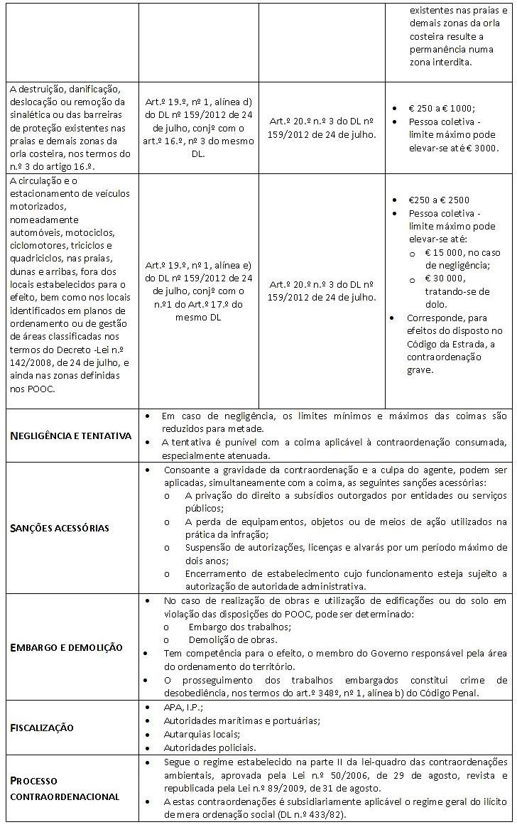 Finalmente, este diploma regula a circulação de veículos motorizados em praias e demais zonas da orla costeira, os quais têm estado na origem de acidentes, nalgumas situações com consequências graves para os seus frequentadores dado que põem em causa a sua segurança, ao mesmo tempo que destroem os solos (de elevada sensibilidade geomorfológica) e o coberto vegetal aí existente, muitas vezes com consequências irreversíveis, lesando o interesse público ambiental. Trata, ainda, da questão das infrações praticadas pelos utilizadores da orla costeira, no que respeita a sinalética e a barreiras de proteção, bem como a transgressão de zonas interditas. Desta forma unifica o regime sancionatório que do antecedente estava disperso pelos Decretos-Leis n.ºs 218/95, de 26 de agosto, e 96/2010, de 30 de julho, procedendo ao agravamento de algumas das coimas.