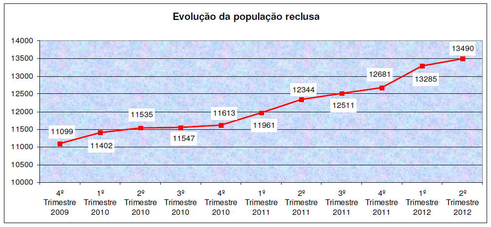De acordo com dados vindos a público, a cada hora que passa uma pessoa vai para a cadeia. Daí que o número de presos, durante o ano de 2012, se tenha aproximado dos 13.500 (o número mais alto dos últimos oito anos) e tomando como referencial valores relativos a 2011, cada recluso custará ao Estado cerca de 40 euros por dia. A este propósito, o Juiz José Manuel Quaresma, do Tribunal de Execução de Penas de Coimbra, afirmou “que o excesso de população prisional não só agrava a pressão dentro das cadeias como põe em causa o percurso de ressocialização do preso”. Para tentar combater o fenómeno de sobrelotação das cadeias, a qual poderá estar relacionada com o aumento de algum tipo de criminalidade (sobretudo contra o património) associado à atual situação de crise económica, a Ministra da Justiça anunciou, no início do Verão passado, a criação de 2.000 novos lugares nas cadeias portuguesas, a conclusão do processo de formação de novos 240 Guardas Prisionais e a aquisição de 40 novas viaturas celulares.