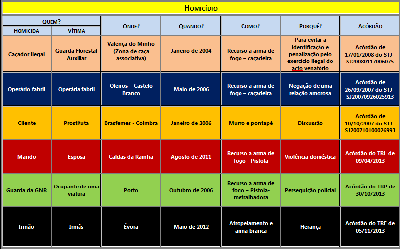 Na jurisprudência portuguesa encontramos alguns acórdãos que são ilustrativos da transversalidade social da prática do homicídio, das suas causas, da incidência geográfica e dos meios utilizados para a sua prática, o que vem corroborar a tese de que se trata de um “crime que todos nós somos capazes de cometer”, defendida em diversos fóruns por António Teixeira, um profissional com larga experiência na investigação de homicídios na Polícia Judiciária[6].