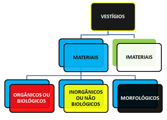 As alterações materiais (vestígios materiais) desdobram-se em diversos tipos de vestígios, podendo essa tipologia variar.