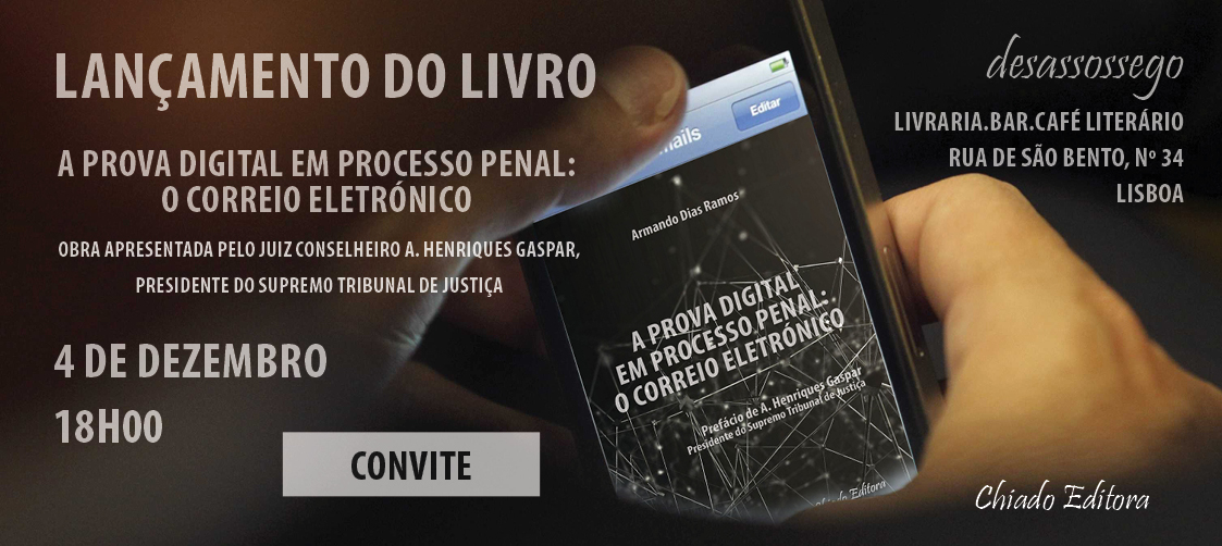 A sessão de lançamento do livro “A prova digital em Processo Penal: o correio eletrónico” será realizada no dia 4 de dezembro de 2014, pelas 18H00, conforme convite em anexo. As honras de apresentação desta obra, que é ímpar na doutrina portuguesa, está a cargo do Presidente do Supremo Tribunal de Justiça, Conselheiro Henriques Gaspar, ilustre jurista, que também escreveu o prefácio da mesma, tendo aí referido que “a abordagem da matéria tratada nesta obra jurídica, juntando interessantes elementos de interdisciplinaridade, revela exemplarmente o desfasamento entre a velocidade da evolução dos instrumentos da informática e as dificuldades de acompanhamento e da intervenção reguladora do direito.”