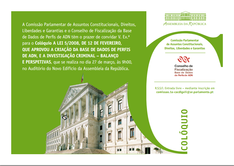 obtidos, da experiência acumulada e da reflexão que foi sendo feita por académicos, magistrados, profissionais da investigação criminal e entidades públicas, ir-se-á realizar no dia 27 de março de 2015, às 9h00, no Auditório do Novo Edifício da Assembleia da República, um colóquio subordinado ao tema “A LEI 5/2008, DE 12 DE FEVEREIRO, QUE APROVOU A CRIAÇÃO DA BASE DE DADOS DE PERFIS DE ADN, E A INVESTIGAÇÃO CRIMINAL – BALANÇO E PERSPETIVAS”.